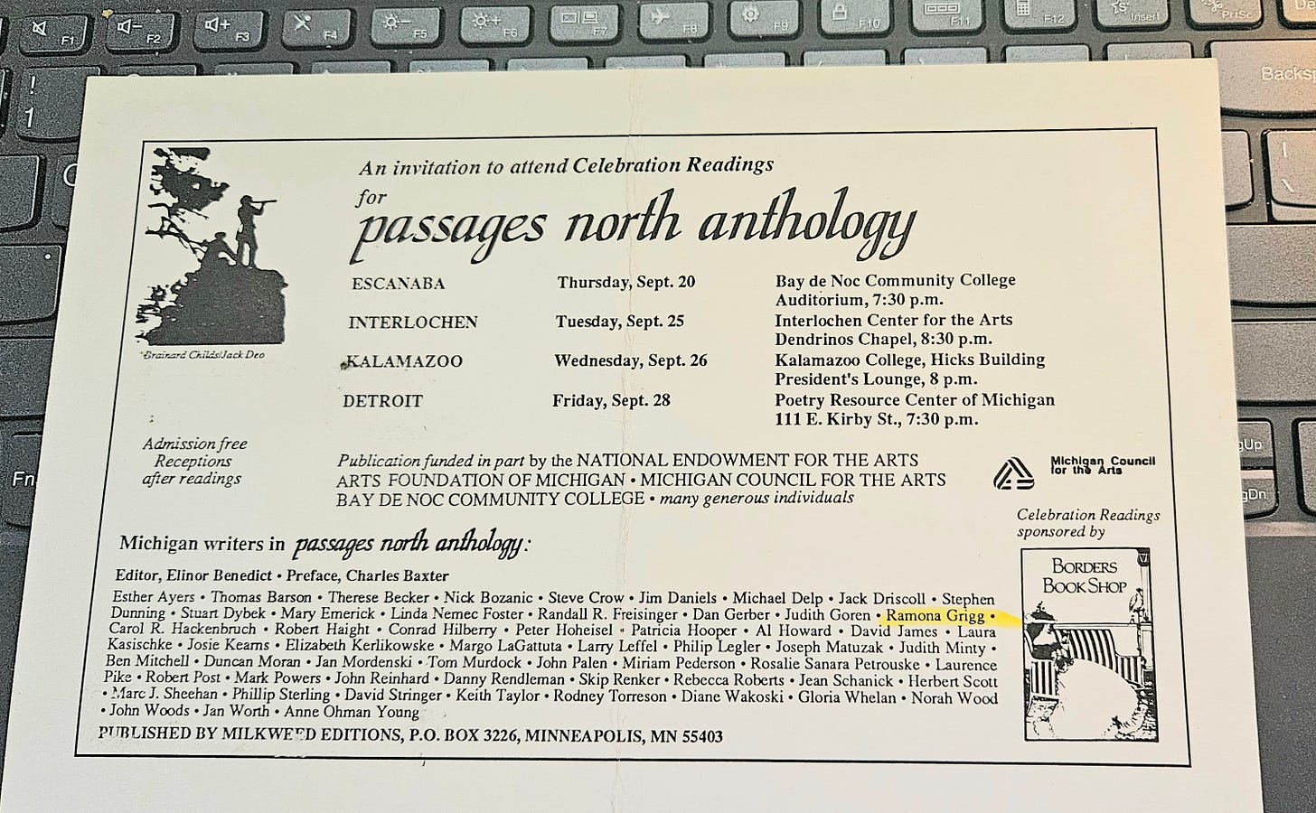 And, damn, I was in really good company. I went to the celebration at Interlochen but I chose not to read my story on stage. I knew some of the writers personally, and knew most of the others by name and reputation, having been involved in one way or another with the writerly world in Detroit, and I was so out of their league I wondered how my story had ever been chosen.
