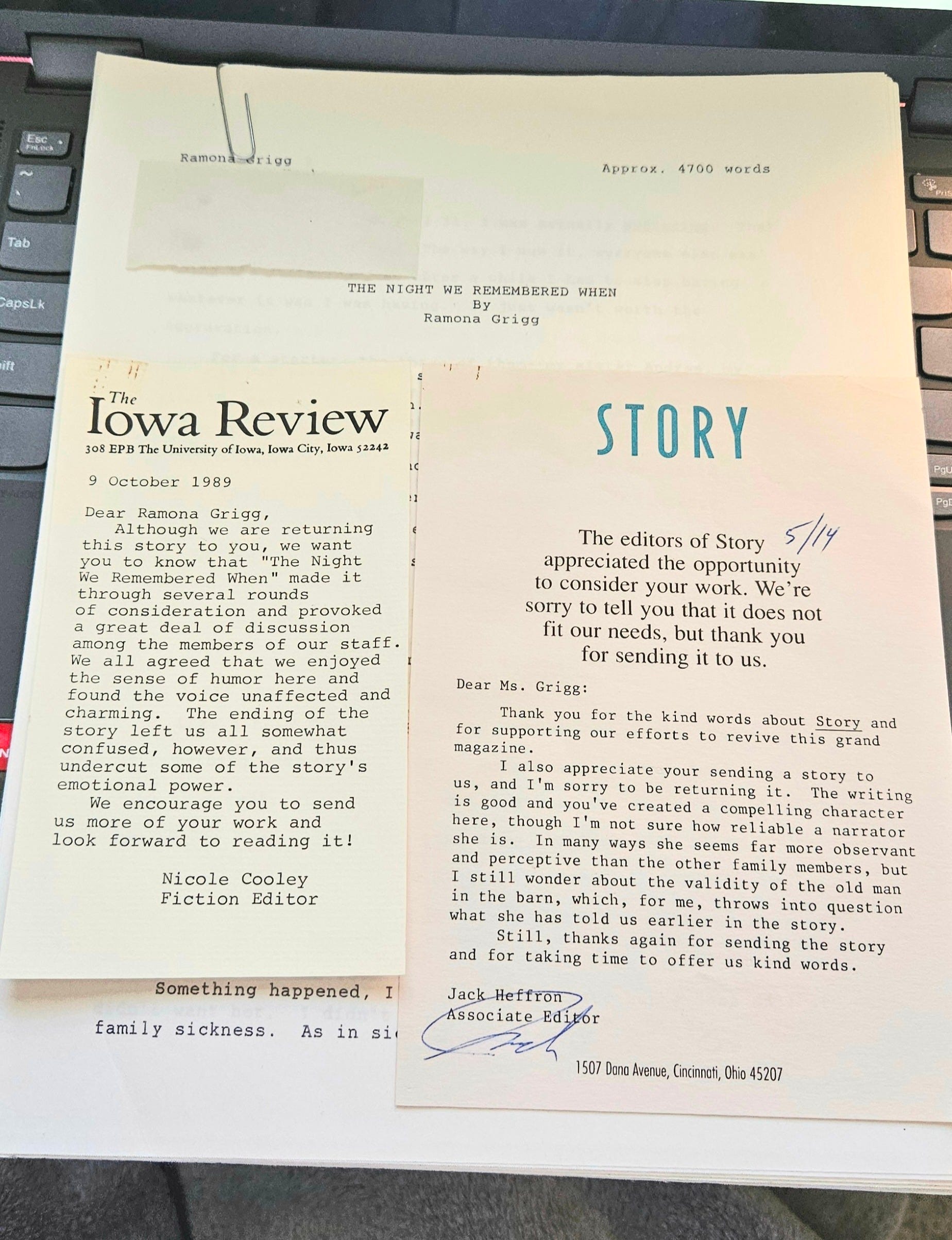 I see by the rejection letters (pictured above) that I sent it to Iowa Review and to Story Magazine, and got hand-written comments. Not what I wanted to read, but even then I knew any writing besides the canned, “Sorry, this is not for us”, was considered a good thing.