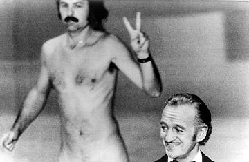 A streaker running across the stage, stealing David Niven’s thunder for a second until Niven recovered and commented on the guy’s physique. I remember it was Niven and not the streaker who got the standing ovation. (See photo above.)