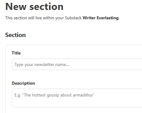 There are a few other prompts on that page but for now this is what you’ll need. Give your Section a title. The short description will appear at the top of that section so that when readers click on it they’ll know what they’re going to find there. It doesn’t have to be long.