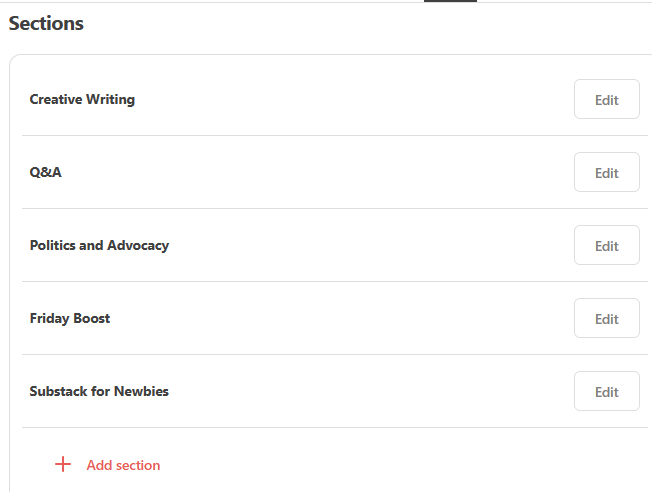 If you’ve already posted pieces that will fit in the new section, you can add them to any section by going back into that post’s Edit page and clicking on the tab at top left, which you’ll seeis now a Sections tab. (It’s not there if you have no sections.)