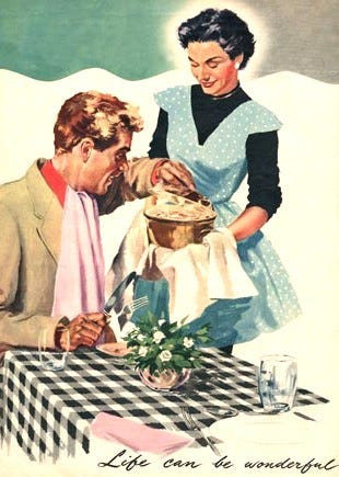 “Don’t deprive your husband of intercourse when he acts like a bear. He may be tired when he comes home tonight. He needs to be pampered, loved, and restored. Fill up his tummy with food; soothe away his frustrations with sex. Lovemaking comforts a man. It can comfort you, too.”