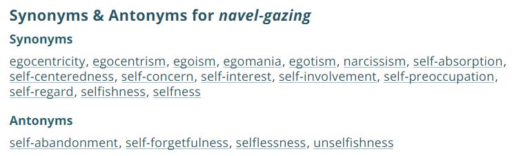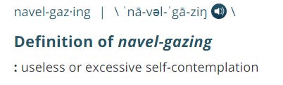 Seriously. And because I was really getting into it — in the middle of the night when nothing was stopping me — I went looking for the definition of ‘navel-gazing’; hoping, I suppose, that the dictionaries would vindicate me and let me get back to sleep.